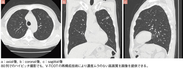 日本国内で2010年12月に発表されたAquilion PRIMEは,東芝社のマルチスライスCTとしては最上位機種に位置づけられる。80列の高速ヘリカルスキャンと160スライスのコンベンショナルスキャンでの撮影が可能だ。また,秒間2572viewsの高密度サンプリングを確保。また,再構成に改良を加えており,ヘリカルスキャンでは64列以上のCTに対応した再構成技術であるV-TCOTを採用している。コンベンショナルスキャンでは,ダブルスライステクノロジーにより,0.5mm×160スライスの倍密度再構成を行い,体軸方向の分解能が向上した。併せて,Aquilion ONEに搭載された再構成アルゴリズムであるconeXactにより,コーンビームアーチファクトを抑えた高画質画像を提供する。
