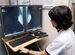 同院の乳房検査は紹介を中心とした精密検査が多くを占める。基本的に視触診,マンモグラフィ,超音波検査は全例に実施しており,2台のマンモグラフィ装置による検査は,月平均で約800件,1日あたり40〜50件,最大で約70件に上る。
