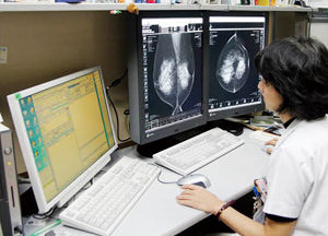 放射線科では,CT 3台,MRI 4台(1.5Tと3Tが各2台)のほか,単純X線,超音波,マンモグラフィなど,数多くのモダリティが稼働している。2003年からPACS導入による完全フィルムレス化をいち早く実現している同院では,レポーティングシステムを構築し,各種造影検査なども含めて,検査画像はすべて放射線科医が読影してレポートを作成している。マンモグラフィの読影は,角田医長を含め2名の放射線科医が担当している。
