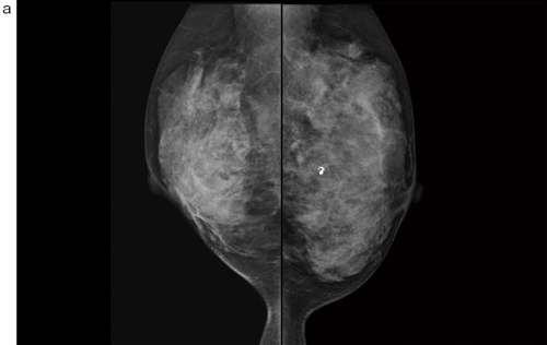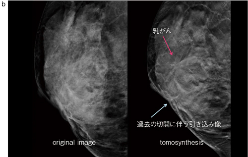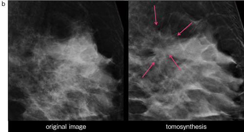 b:左MLO拡大画像(左),トモシンセシス拡大画像(右)