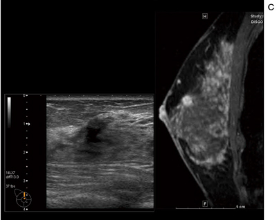 超音波検査は,トモシンセシスの苦手な部分をカバーするが,その反対のケースもある。例えば,脂肪と等エコーの腫瘤は拾い上げることが難しいこともあるが,トモシンセシスでは描出が容易である。また,超音波での拾い上げが難しい大きな乳房の中の小さな腫瘤は,トモシンセシスで存在位置を確認して,超音波で該当箇所を重点的にスキャンすることで認識することができ,超音波ガイド下生検でのアプローチが可能になる。