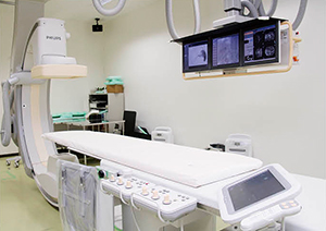 同院で稼働しているAllura Xper FD20は,ピクセルサイズ154μmの高精細フラットパネルディテクタ(FPD)を採用。パネルのサイズは,30cm×38cmで,全身の検査やIVRに対応する。このFPDは,遠隔操作で縦横90°回転して広範囲の撮影を行えるほか,リフレッシュライトで残像をなくすことで高速撮影も可能にしている。さらに,同社独自の2k×2kイメージングチェーンにより,従来機種の4倍のマトリックスで画像を収集し,微細な血管を高精細に描出することが可能である。このほか,寝台の横には,タッチパネル方式のカラー液晶を採用した操作卓“Xperモジュール”が設置されており,指1本で直感的な操作を行うことができ,手技を支援する。
