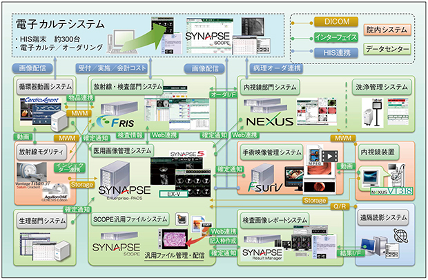 同院では,2011年から電子カルテシステムやPACSなど病院情報システムの導入を進めてきた。特に画像情報に関しては,CTやMRIなど放射線画像の保存・管理を行う医用画像管理システム(SYNAPSE)のほかに,循環器動画像システムや内視鏡部門システム(NEXUS),検査画像レポートシステム(SYNAPSE Result Manager),汎用ファイル管理・配信システムなどを導入し,これらを検査画像統合システム「SYNAPSE SCOPE」(以下,SCOPE)で統合管理し,ポータルビューワによる閲覧を可能にしている(システム構成図参照)。これらのITシステムは,病院だけではなく法人内の介護施設を含めて情報共有と連携推進を可能にすることを目的に構築されたもので,患者ID・ユーザーIDの一元化,サーバの仮想化,データセンターの活用など最新技術を駆使した構築が行われている。
