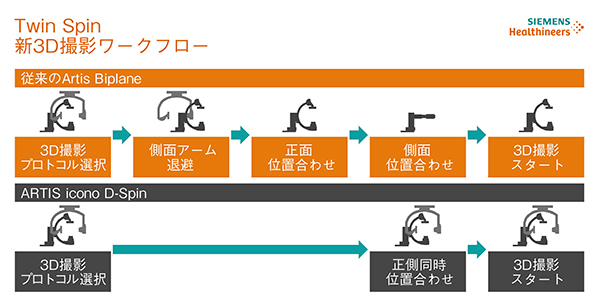 従来のバイプレーンシステムは,2D撮影から3D撮影に切り替える際に側面アームを退避させなければならなかった。一方,ARTIS iconoは,高速・広範囲回転が可能な側面アームを搭載。側面アームが正面アームの動きに追従することで,バイプレーンセッティングのままで3D撮影を可能にした。このTwin Spinによって撮影準備時間を短縮でき,早期の治療に結び付けることができる。加えて,側面アームと正面アームで同時に透視を行うことで,3D撮影前の関心領域の位置合わせも効率化。さらに,側面アームと周辺機器の干渉を防げる。