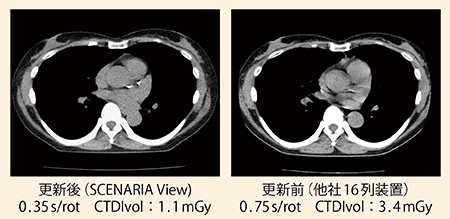 SCENARIA View撮影条件(左):120kVp,0.35s/rot,BP1.08,CTDIvol:1.1mGy 更新前の装置と比較し,1/3以下の低線量条件でも良好な画質が得られている。0.35s/rotでの撮影により,心臓のモーションアーチファクトも低減している。