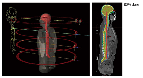 高身長症例にてアイソセンタは4つとなった。全脳部分は2回転とし,全脊髄部分はすべて1回転とした。計5回転の照射である。