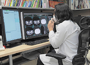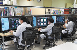 画像診断機器は,CT 3台(2管球式,320列,80列),MRIは1.5T 2台と3Tの計3台,核医学検査は3検出器型と2検出器型のガンマカメラが各1台,血管撮影装置2台のほか,一般撮影装置,マンモグラフィなどが整備されている。検査件数は,CTが1日140〜160件,MRIが1日40〜60件,核医学検査が約10件。読影については画像診断管理加算2を算定していることから,時間外の検査(1日平均20件程度)を含めてCT,MRI,核医学検査については翌診療日までに,ほぼすべてのレポートを作成している。そのほか読影依頼のある一般撮影やマンモグラフィについてもレポートを作成する。鈴木先任准教授は,放射線科の読影体制について,「基本的には,検査終了から時間を空けずに読影を進めるようにしています。検査で偶発的な所見が見つかれば臨床医に連絡して,いち早く患者さんにフィードバックすることが理想ですので,できるだけタイムラグのない読影体制を取っています」と説明する。