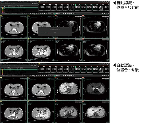 臓器セグメンテーション技術を生かした自動位置合わせ機能。同一モダリティだけではなく,CT,MRIなど異なるモダリティ間の位置合わせを行える。画面は肝臓の造影CT(左4シリーズ)を基準に,EOB-MRI(右4シリーズ)の位置合わせを行った例。