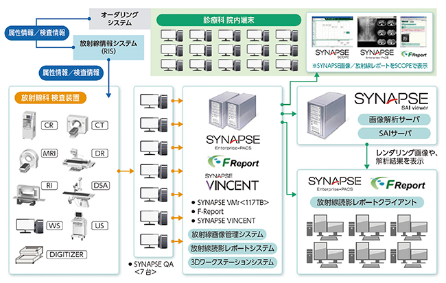 SYNAPSEは,大容量化する画像データに対応するためサーバサイドレンダリング方式を採用したPACSで,サーバ上で処理した結果のみをクライアント端末に返すことで表示スピードの高速化を図っている。これによって,画像クリックから表示までの時間や操作の際のレスポンスが向上した。システムの構成としては,電子カルテシステムと放射線情報システム(RIS)と連携して,SYNAPSEとレポートシステム(F-Report),画像処理ワークステーション(SYNAPSE VINCENT)などが稼働する。院内では,電子カルテ端末上で検査画像統合システム「SYNAPSE SCOPE」を利用して画像とレポートを参照できる。SAI viewerは,SAIサーバと画像解析サーバ(SAI viewer用画像処理プログラム)を立てることでPACSのクライアントとして利用できる(システム概要図参照)。