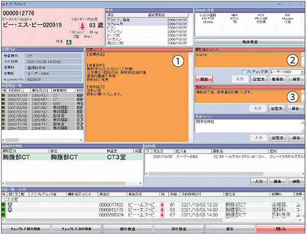 ARIStationのプレチェック画面 依頼コメント((1))や撮影指示コメント((2)),連絡コメント((3))の欄が設けられ,確実な情報共有に役立っている。