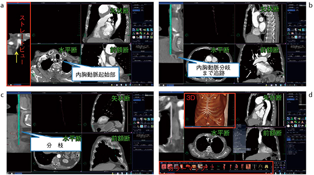b:ストレートビュー上に自動抽出された内胸動脈を左ドラッグして左右に回転させ末梢まで追跡する。