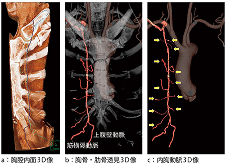 c:内胸動脈のみの3D像。径1mm以上の分枝(→)が描出されている。