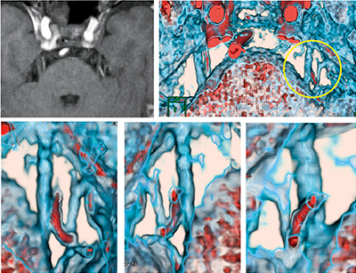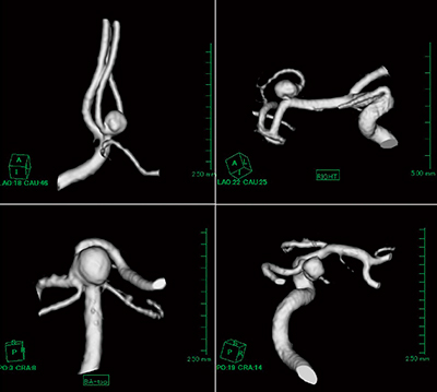 頭部MRI検査では,動脈瘤のあるすべての患者のVR画像を作成する。年間の作成件数は約840件である。さらに,当院ではクモ膜下出血患者の約80%が脳血管撮影を行わず,MRAで動脈瘤の位置や形状を確認した後,手術となるため,日中や夜間の緊急などを問わず,それらのすべてにおいて動脈瘤のVR画像を作成している(図1)。