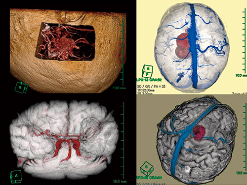 主に脳腫瘍や脳動静脈奇形(AVM)の手術シミュレーション画像を作成している。撮像は造影FLASH法のみを用いて,複数のシーケンスを用いることによる位置ズレを避けている。この1つの元画像から頭表,頭蓋骨,脳表,腫瘍,血管を分離して配色した後,再構成してシネ表示で報告している(図3)。