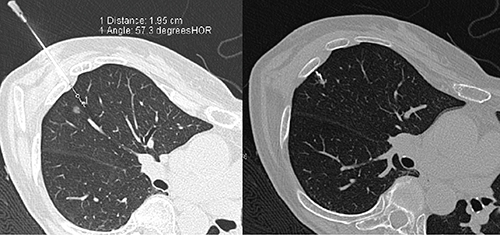 胸腔鏡補助下で外科的切除を行う場合,病変部が微小で体表に近いものについては,術前にCTガイド下でフックワイヤを使用し経皮的にマーキングを行う(図1)。しかし,病変部が深部に存在する場合,経皮的なマーキングでは,隣接する他臓器との解剖学的位置関係から,気胸や出血,肺の血管が大きく損傷されることで起こる空気塞栓などの合併症に注意を要するため,穿刺が非常に困難となる。そこで,胸腔鏡下にて病変部を肉眼的に特定することを目的として,術中に気管支鏡により気管支の内側から光源によるマーキングを行うことが有効と考える。