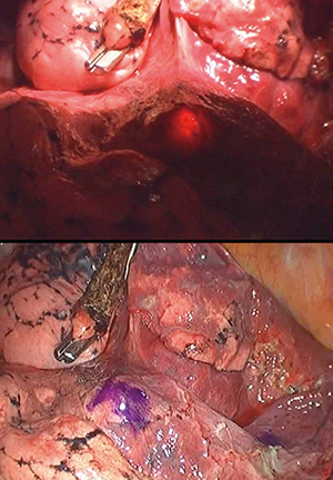 また,マーキングの手法として,切除時にX線透視を使用して病変部を確認する場合は,バリウムやリピオドールを気管支鏡にて注入する場合もあるが,今回,われわれは胸腔鏡下にて病変部を肉眼で直接確認することを目的に,術中にスコープを病変部に到達させ,その光源でマーキングし,位置を特定する手法を行った(図2)。