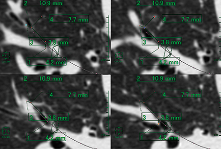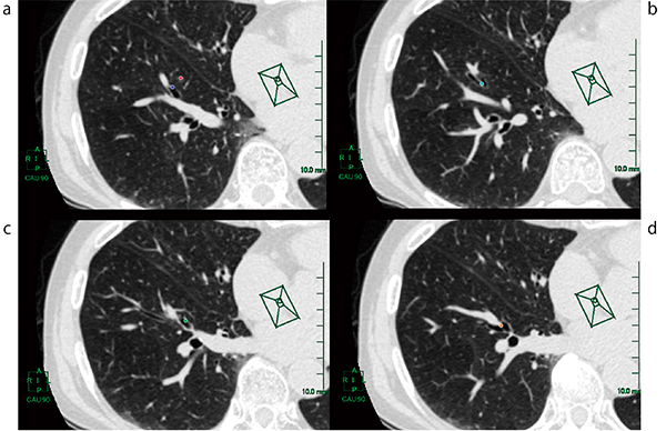 (1) AZE VirtualPlaceの仮想内視鏡画像作成用のアプリケーションにて,二次元画像上で目印を付けていく(図3)。右肺S8病変部(図3 a ●),病変部から垂直に下ろした気管支との交点(図3 a ●),そこから末梢の気管支分岐部(図3 b ●),1つ近位の気管支分岐部(図3 c ●),2つ近位の気管支分岐部(図3 d ●)とする。