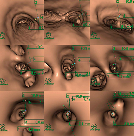 当施設では,TBLBの際の支援画像として,病変部の位置特定のために仮想気管支内視鏡画像を作成してきた。今回は,術中に気管支鏡を使用して位置を特定するという依頼内容であったため,応用が可能であった。評価されるべき点としては,AZE VirtualPlaceの仮想内視鏡画像作成用のアプリケーションが,ただ内側から見るだけではなく,二次元画像上の位置や距離などの情報を三次元画像上で表現でき,これによって目標や経路を特定できることと考える。また,気管支以外の臓器であってもこの機能を利用して,さまざまな手技に対しての手術支援画像を作成することが可能であると考える。