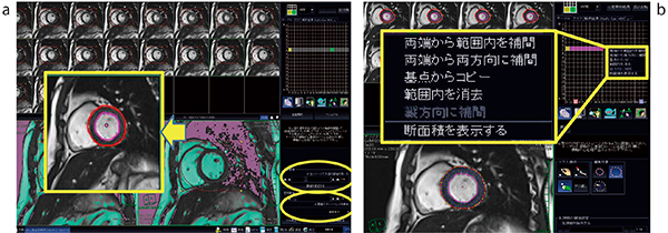 b:撮像時の呼吸停止の不良や頻脈など,自動解析がうまくいかない場合は,手動にて2スライス,あるいは3スライスを再トレースすることで,そのほかのスライスを補完できる。そのため,1枚1枚すべてを再トレースする手間が省略できる。