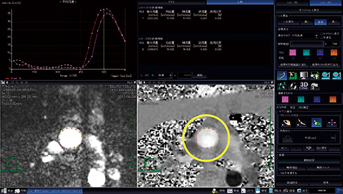 撮像時のVENC値を入力し,目的血管を1スライスのみROI(○)で囲むだけで,各時相のスライスの目的血管を追従してトレースしていく。