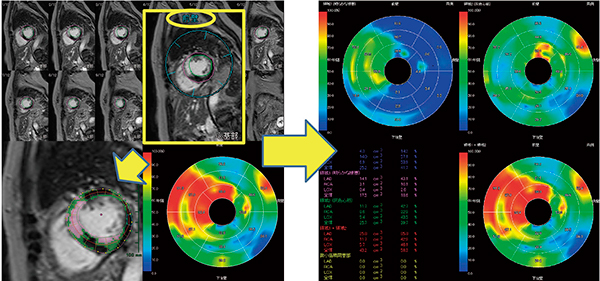 心臓の形態機能評価はエコーや血管造影,造影CTにて行われてきたが,侵襲的要素があり,術者間による差異など客観的評価が難しい。今回,MRIにてSociety for Cardiovascular Magnetic Resonance(SCMR)の推奨プロトコールを基にSSFP系シーケンス(True FISP)を用いて1心拍あたり20フェーズのシネ画像を撮像し,画像解析にAZE VirtualPlace雷神3.5の“MR心駆出率解析”のソフトウェアを使用することで形態機能評価を行うこととした(図1)。