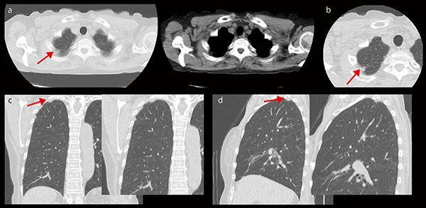 a:アキシャル画像 b:HRCT c:コロナル画像 d:サジタル画像