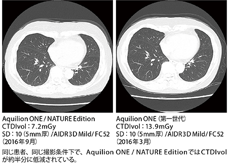 Aquilion ONE/NATURE Editionの“pureViSION Optics”は、X線の出力から検出器までを最適化することで被ばく線量の低減と画質向上を両立させている。同院でAquilion ONE(第一世代)とAquilion ONE/NATURE Editionで撮影された同一患者の胸部CT(同じSD)を比較したところ、CTDIvolが13.9から7.2になり、領域別では頭部で40%、胸部46%(心臓30%)、腹部48%の線量低減となった。永田主任は、「同じADCTであり、画像再構成法(AIDR 3D)も変わらないことから、線量には大きな差はないと考えていましたが、大きく削減されていることがわかりました。これは、新しいX線光学技術であるpureViSION Opticsの効果と思われます」と述べる。