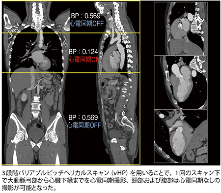 また、異なるヘリカルピッチの撮影を連続して行えるバリアブルピッチヘリカルスキャン(vHP)は、最新バージョンで従来の2フェーズから3フェーズの切り替えに対応した。これによって、心電図同期が必要な心臓近傍を挟んで頭頸部側と腹部側を非同期で撮影するなどのプロトコールの設定が可能になった。永田主任は、「大動脈解離の検査では、心臓血管外科から頸部側の血管状況も確認したいという要望があり、以前のvHPでは眼窩から心臓下端までを心電図同期で、骨盤部までを非同期で撮影していましたが、3フェーズになったことで大動脈弓部から心臓下端までを同期、それ以外を非同期での撮影が可能になりました」と述べる。