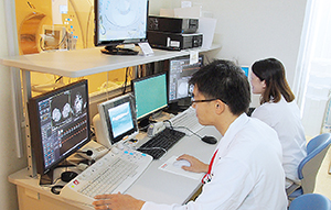 同院では、2004年に開設されたPETクリニックのPET/CTや、2014年にオープンしたハイブリッド手術室など、高度医療機器の導入を積極的に進めている。画像診断機器では、320列と80列(Aquilion PRIME)の2台のCTをはじめ、MRIが3T 1台を含む3台、血管造影装置3室、マンモグラフィ、ガンマカメラなどが導入されているほか、CT同室リニアック(稼働準備中)、ガンマナイフなど放射線治療の設備を整えている。また、一般撮影、胃透視、マンモグラフィの3台の健診バスを導入するなど、検診事業にも力を入れている。