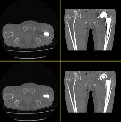 Aquilion Lightning / Helios Editionでは、金属アーチファクト除去技術のSEMARが標準搭載されている。整形外科では、人工股関節置換術後のフォロー検査を行っているが、インプラントが留置されていてもSEMARによって関節周囲の観察が可能になったと永田技師長は評価する。