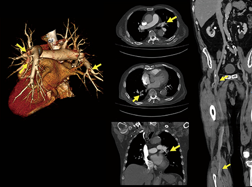 1回の造影で広範囲撮影が可能。肺塞栓および下肢静脈血栓の複数の所見を確認できた。