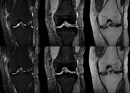 16chフレキシブルSPEEDERは、患部に密着させることができるため、高いSNRを得ることが可能。高SNRを生かした高分解能撮像になり、軟骨構造が明瞭に描出されている。