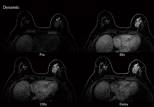 MRI検査を担当する江原主任は、Galan 3Tの画質について、「全身どの部位でも高画質に撮像できます。患部に密着できる16chフレキシブルSPEEDERでは高いSNRの画像を得られ、膝や手足などの整形領域、体幹部などさまざまな領域に有用です(図1)。当院では、乳腺外科から術前評価や薬物療法の効果判定のためのオーダも多いのですが、乳房撮像でも脂肪抑制が均一によく効き、安定した画像を得られます(図2)」と述べる。