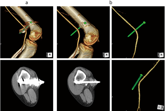 図2 大腿部釘刺し外傷(膝窩動脈へ向かう釘の評価)