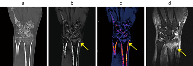 図3 橈骨遠位端骨折 CTで不顕性であったが、BBIで骨折部位が確認できた。3日後のMRIとも良好に一致している。