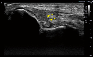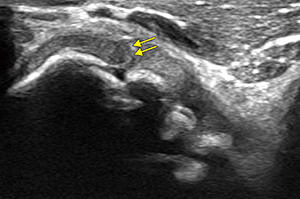 岩本部長が、Aplio i800でこだわり、一番のターゲットとしているのが肘関節の軟骨の描出である。岩本部長は、NPO法人(江戸川スポーツ医学研究会)で少年野球選手を対象とした野球肘検診にも取り組んでいる。野球肘は投球障害肘とも呼ばれ、投球動作によって生じる筋や腱、靭帯などの障害や骨軟骨の外傷・障害である。部位によって、内側障害 、外側障害、後方障害に分類されるが、外側の離断性骨軟骨炎は軟骨やその下の骨がはがれることで、疼痛やロッキングなどの障害が発生する。離断性骨軟骨炎は、初期であれば保存的治療を行い経過観察を行うが、軟骨が剥離するなど進行している場合には手術が必要となる。岩本部長は多くの野球肘の症例を診療する中で、「従来の超音波診断装置では、軟骨部分は黒くなっていて内部の状態はわかりませんでした。軟骨の下にある骨(軟骨下骨)の状態を確認していましたが、Aplio i800では軟骨の内部が濃淡のある画像として確認できました。特に子どもの肘関節は軟骨が厚く、内部の状態がわかれば手術適応など治療方針の決定に寄与することが期待されます」と説明する。さらに、「スポーツ選手の診療で重要なポイントとなるのが競技復帰時期の判断です。いつから復帰できるのか、どの程度練習に参加してよいのかは選手にとっては重要な問題で、その判断のための情報は多い方がより適切な判断ができます。Aplio i800の高画質画像が有効な情報になるのではと考えて、症例を蓄積しながら検討しているところです」と述べる。