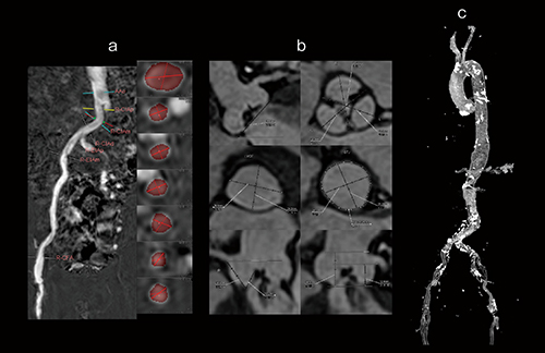 血清クレアチニン2.72mg/dL、eGFR 18.7mL/min/1.73m2と腎機能が悪く、造影CTが困難であった症例。アプローチサイトの計測(a)、弁周辺情報の計測(b)、石灰化の評価(c:非造影MRA+単純CTのフュージョン)で、TAVIに必要な項目が非造影MRIで得られる。