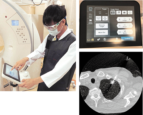 Aquilion ONE / PRISMでは、CT透視下手技のための新しいシステムが利用できる(オプション)。新CT透視システムは、タッチパネル式の操作卓を採用し、画面やボタンなどのユーザーインターフェイスも一新された。タッチパネルは術者が自ら操作して穿刺を行えるよう設計されているが、同院では医師は穿刺の手技に専念するため、技師が検査室内で寝台や撮影モードの切り替えなどの操作を行っている。遠藤技師は「新CT透視システムでは、寝台脇でほとんどの操作が可能で検査室の中で完結できます。以前は、撮影モードの変更などは操作室のコンソールでしか操作できなかったので技師2名が必要でしたが、1名で対応可能となりワークフローも向上しました」と評価する。長谷部教授は、CTガイド下手技について、「病理から遺伝子へ診断技術が高度化することで、生検にはより細かく複雑な手技が求められています。正確な診断を行うためにもCTガイド下手技はこれからますます重要性が高まるでしょう。それに対応するためにも、正確な手技をより低被ばくで行うことが重要で、Aquilion ONE / PRISMへの期待は大きいですね」と述べる。