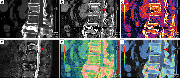 virtual non calcium imageや電子密度画像で、MRIのSTIRと同様に新規圧迫骨折(◀)が高信号で描出されている。