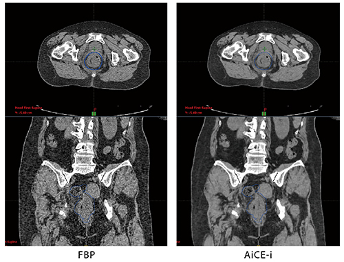 AiCE-iでは粒状性を維持しながら高いノイズ低減効果が得られている。コンツーリングの精度、効率が向上するとともに被ばく低減も期待される。