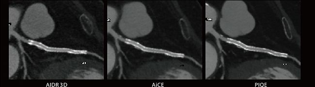AiCEはAIDR 3Dと比較しステント(Ultimaster、3.0×18mm)のブルーミングアーチファクト、ノイズが低減されている。PIQEではさらに低減され、ステント内腔のより正確な診断が期待できる。また、違和感なく大幅なノイズ低減がされていることにより、被ばく低減にも期待できる。