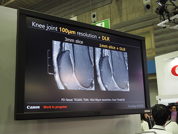 キヤノンメディカルシステムズでは,横浜開発センターに次世代MRI開発部門を設け,Compressed Sensingやディープラーニングを用いた再構成処理などの先進的な研究開発を進めている。ボルドー大学や熊本大学との共同研究の取り組みがアナウンスされているが,ブースではMR画像のDeep Learning Reconstruction(DLR:W.I.P.)を用いた画質向上の成果や,3T装置で撮像された,1024×1024マトリクス,0.2×0.2×3mmの7T MRIに匹敵する超高精細画像(W.I.P.)なども紹介した。