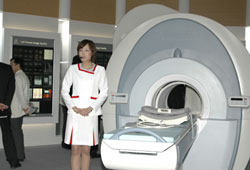 展示では,3Tとしてはコンパクトで開口径の大きい本体のデザインが注目され,実際にベッドに載ってガントリ内での広い空間を体験する姿が見られた。
