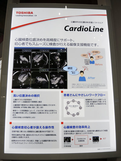 なかでも最大のトピックは,心臓MRIでの位置決めをスピーディに行える世界初の「CardioLine」をオプションで採用したことである。位置決めアシスト機能であるCardioLineは,事例ベースで特徴的な部位を推定する技術により,心臓MRIの基本的な6断面を高精度に決定することを支援する。このため,従来約50分かかっていた検査時間を約40分に短縮することが可能となる。さらに,折り返しアーチファクト回避機能によってスキャンミスをなくし,被検者の息止めの負担を軽減する。この技術は杏林大学付属病院放射線医学教室などとの共同研究により開発されたという。近年,撮像技術の進歩により心臓MRIがニーズが高まり,診療報酬においても「心臓MRI撮影加算」がある。一方で心臓MRIは,検査時間が長く,操作に習熟していないと撮像が難しいといった問題があった。CardioLineはこれらの問題を解決する技術として,普及が期待される。