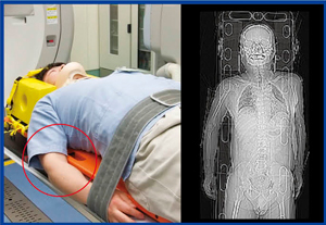 外傷スクリーニングCTの撮影において,上肢を拳上することは時間のロスにつながる。当センターでは,バックボードの横に肘を下垂させた肢位をとることによって,ストリークアーチファクトの軽減に努めている(図6)。