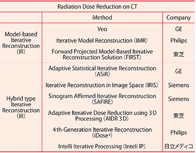 Iterative Reconstruction(IR)法に関しては,投影データから画像を生成する逆投影と,画像から投影データを生成する順投影を繰り返し行うことにより画像再構成を行う完全なIR法に基づくModel-based IR法と,IR法を応用して種々の投影データ側での前処理や画像データ側での後処理に統計学的なモデルを利用して画像再構成を行うHybrid type IR法に大別される(図2)。