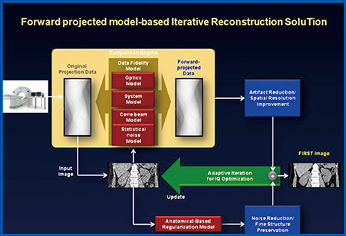 FIRSTでは,初めに収集した投影データからFBP法で初期画像を作成し,次いで光学系モデルや統計モデルなどのモデルを考慮し,Forward projectionにより投影データを作成し,収集データと比較して差分を初期画像にフィードバックし,画像を更新して,アーチファクトのないシャープな画像へと更新する。併せて,初期画像をAnatomical modelをベースに,よりノイズの少ない画像へと更新する。以上の「投影データ処理での更新情報」と「画像データ処理での更新情報」を総合的に判断して最適な画像へと更新し,これらの処理を繰り返して収束した段階で最終的な画像を作成することで,よりノイズ低減を可能にした低線量CT画像を作成することが可能である。
