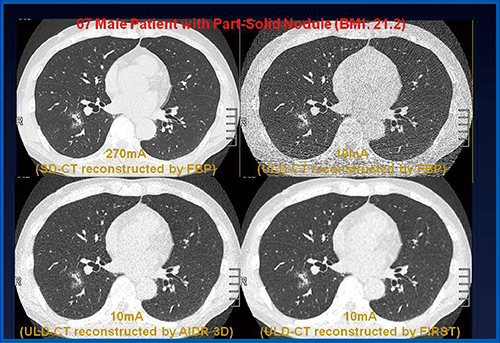 右下葉にpart-solid noduleを認める。FBP法にて再構成した270mAの画像と比して,FBP法およびAIDR 3Dにて再構成した10mAの超低線量CT画像と比較して,FIRSTにて再構成した10mAの超低線量CT画像はノイズも少なく,すりガラス結節の描出能も270mAの画像と同等であり,さらなる低線量化の可能性を示唆していると考えられる。