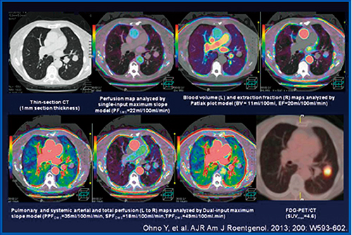 ADCTの臨床応用として,ほかのヘリカルスキャン方式を採用しているMDCTとの絶対的な差別化は,寝台移動を伴わず,0.5秒以下の回転で160mmの高精細ボリュームデータを用いた血行動態評価が可能であり,真の造影灌流CT検査(CE-perfusion CT)を,低被ばくで中枢神経領域や心臓領域において施行することが可能になった5),6)。同様に,胸部領域においても160mmの高精細ボリュームデータの取得は,肺結節の血行動態解析においては十分臨床応用可能な撮影手法であり,本手法はDynamic造影灌流面検出器型CT(Dynamic CE-perfusion ADCT)として,肺結節の良・悪性鑑別診断法として臨床応用が2011年以降から継続的に進められてきた。本手法を用いることにより,PET/CTに比してより正診率高く良・悪性鑑別診断が可能であることが明らかにされるのみならず,Single-Input Maximum Slope法,Single-Input Patlak Plot法やDual-Input Maximum Slope法などのさまざまな血行動態解析モデルが診断精度に影響することも明らかにされてきた7),8)(図5)。