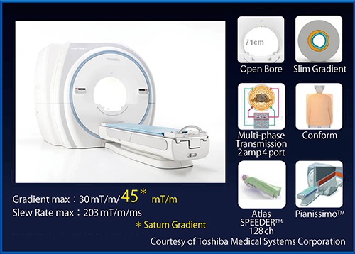 3T MR装置の最大の利点である高い信号-ノイズ比(signal to noise ratio:SNR)は,理論的には静磁場磁束密度(B0)に比例するので1.5T MR装置の2倍のSNRが得られる1),2)。この高いSNRは高空間分解能化,あるいは撮像時間の短縮化を可能にする。しかし,3T MR装置は高いSNRが得られる可能性がある反面,画質劣化に影響するいくつかの根源的事象を伴うことも知られている1),2)。したがって,Vantage Titan 3Tは,71cmのOpen Boreを有する新たな3T MR装置であり,1.5T MR装置と比較してさまざまな撮像上の制限を凌駕するために,ガントリシステムにおける(1) Pianissimoシステムと(2) Conformテクノロジー,グラディエントシステムにおける(3) Maximum Gradient 30mT/mおよび(4) Maximum Slew Rate 203mT/m/msを有するSlim Gradientコイル,RFシステムにおける(5) Multi-phase TransmissionおよびコイルシステムにおけるAtlas SPEEDERを可能とする全身で使用可能な各領域におけるPhased Array Coilであり,総エレメント数は128エレメントになるRF receive systemなどを用いている。そして,本JRC2015において新たなグラディエントシステムとして,Maximum Gradient 45mT/mを可能にする“Saturn Gradient”システムを搭載された新モデルが紹介された(図1)。現時点で,神戸大学ではSaturn Gradientシステムを搭載したVantage Titan 3Tをまだ使用できていないので,本講演および本稿においては従来のVantage Titan 3Tを基に説明する。
